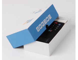 數碼產品包裝盒,采用157g雙銅紙裱1000g灰板紙,四色印刷,過啞膠。天地蓋包裝紙盒,方便快捷,盒身整體白色與藍色邊沿搭配,簡潔,清新,大方。電子產品包裝盒內置紙質內托,在節約了成本的同事,也對產品具有很好的保護效果。