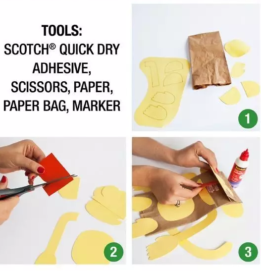 然后用紙和彩色筆制作出貓頭鷹的眼睛,再剪一個小菱形作為它的鼻子,準備就緒之后就可以把它們貼在備好的手提紙袋上了。