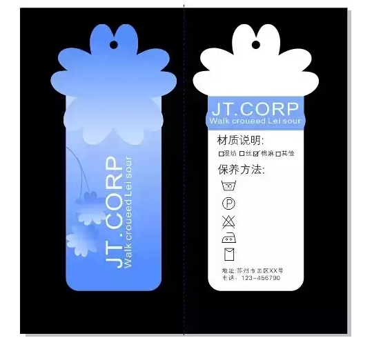 設計服裝吊牌的第十步:添加文字 在服裝吊牌上標注:產品名稱、成分含量、洗滌方法,廠名廠址、產品安全技術類別等必要元素內容。