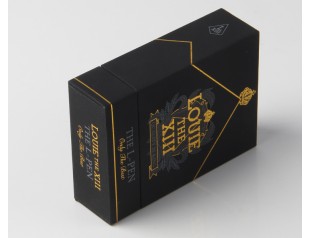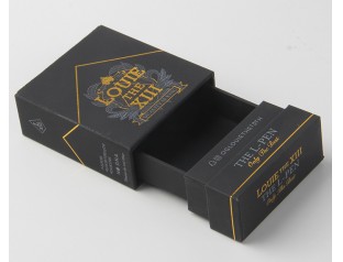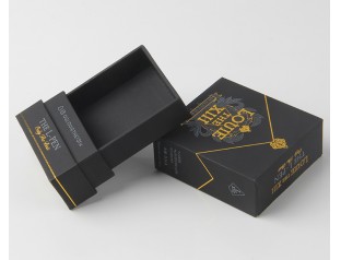 金色、白色的文字、圖案、線條互相交錯,本以為錯綜復雜的排版會讓版面變得異常的凌亂,但這個盒子卻沒有給人凌亂的感覺,驚不驚喜,意不意外?以黑色為底,白色和金色來點綴,看似凌亂的排版其實也是很有講究的,所以才沒有造成到處“撞車“的局面。抽屜式的設計讓盒子更有層次感,內盒用和表面一樣的材料來裱,使表里如一,更顯專一。logo表面圖案使用印刷工藝,圖案清晰;精美的logo燙金工藝使品牌logo更加的醒目有質感。