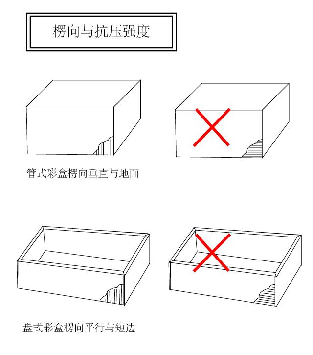 瓦楞紙箱,楞向的縱向的抗壓強度比橫向高很多。管式彩盒一律采用豎紋,讓楞向垂直于地面;而盤式彩盒盡量要楞向平行與較短一邊,這樣的安排獲得比較高的抗壓強度。