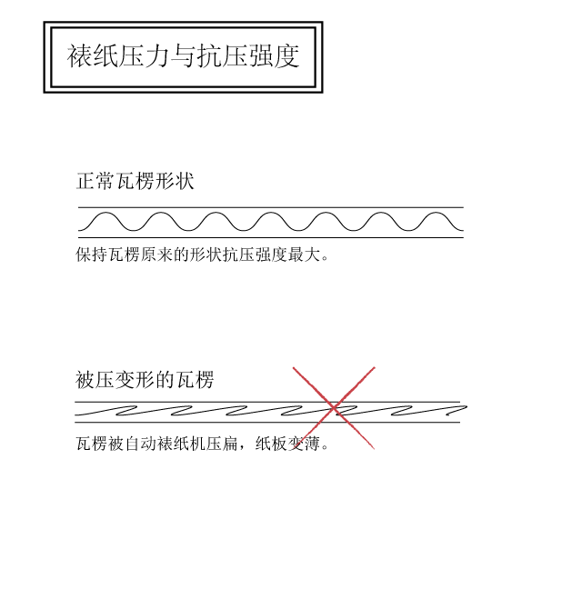 有的客戶希望不希望盒子的切面看見瓦楞,也有工廠裱紙師傅為了防止裱合不良,過分加大壓床的壓力、或者膠水輥的壓力,導致瓦楞被壓變形,犧牲了瓦楞紙盒的抗壓強度,對此包裝印刷廠家在裱紙的環節應該提醒工人不要過度用力按壓瓦楞。