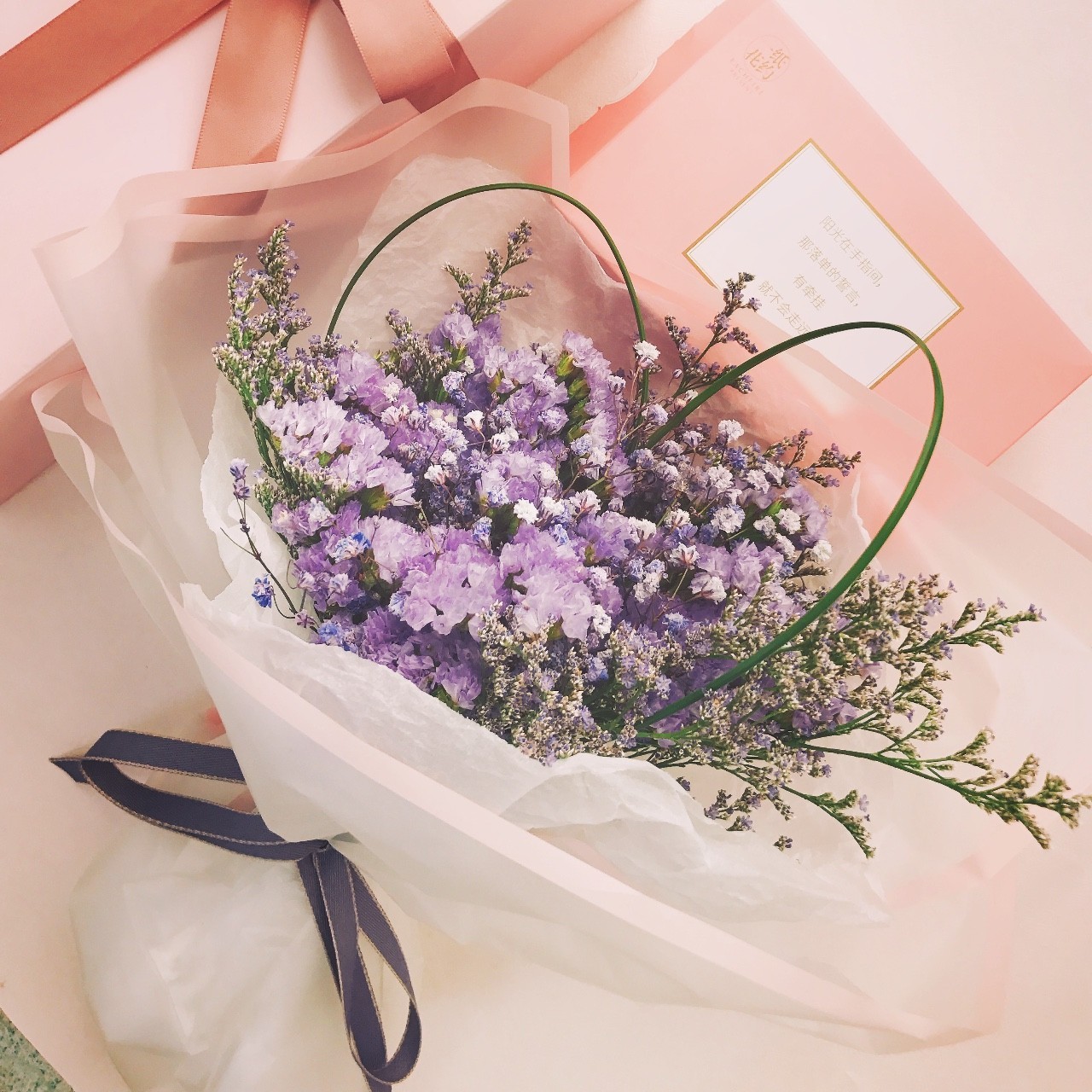 如上圖,小編的這束花的特別之處在于在束花里加了鋼絲草,做成了愛心的造型。在這個表達愛意的節日里,當然要無處不在的比心心以表誠意啊~