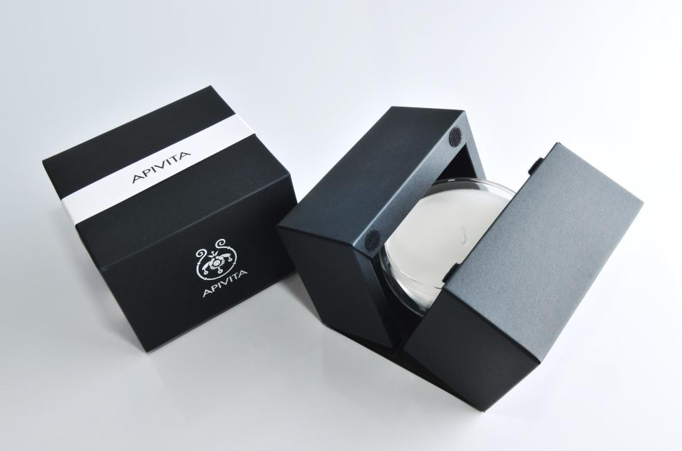 APIVITA香薰蠟燭包裝,黑色卡紙的盒型結(jié)構(gòu)比例合理、結(jié)構(gòu)嚴(yán)謹(jǐn)、造型簡(jiǎn)單精美,突顯出盒型的形態(tài)與材質(zhì)美,力求達(dá)商品保護(hù)并襯托出透明蠋臺(tái)的層次感,左右開盒的禮盒效果展現(xiàn)商品驚喜的價(jià)值感。