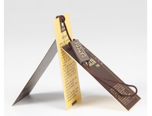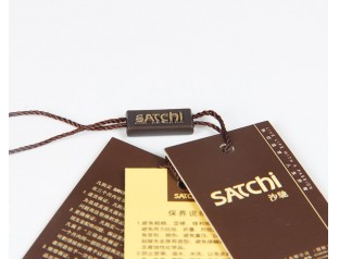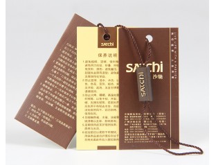 此款服裝吊牌采用400g雙銅紙,四色印刷,過光膠服裝吊牌設計整體采用了棕色作為主打色,搭配白色字體,兩個最柔和的顏色搭配在一起,優雅感十足廣州駿業吊牌廠定制的吊牌,采用優良材質,流程生產機械化與人工的配合,打造出高質量的紙質吊牌。