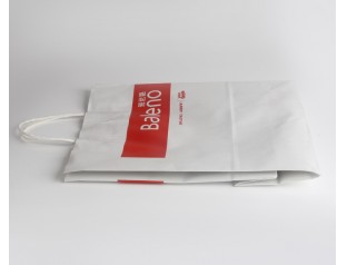 此款手提紙袋采用白牛皮作為原材料,故又叫做白牛皮紙袋,單色印刷,黏紙繩白牛皮紙手感柔軟,厚度均勻印刷效果的優點就是鮮亮,節省油墨,可以有效的降低成本此款白牛皮紙袋,白色LOGO的印刷搭配打底的大紅色印刷,可以使其LOGO更顯眼,彰顯其品牌價值。
