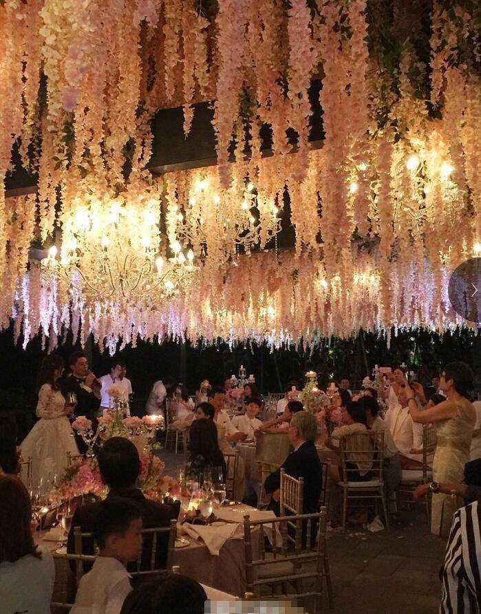 婚禮在寶格麗酒店著名水上婚禮地點舉行,婚禮儀式上,趙薇出席,與范冰冰“還珠幫”合體。此外,胡歌、徐若瑄、周迅、吳奇隆、劉詩詩、劉濤等人現身。婚禮儀式以撥動愛的心弦為主題,采用林心如最愛的粉絲布置,最引人注意的是舞臺中心的雙層心形花架。   晚宴內場曝光!旁邊就是懸崖,能聽到海浪的聲音~布置靈感來自節日焰火,用了4種不同顏色、50000支的紫藤花串,微妙的漸變由粉到白,中間點綴50盞水晶,好似云霧中綻放的煙火~敲有心思!