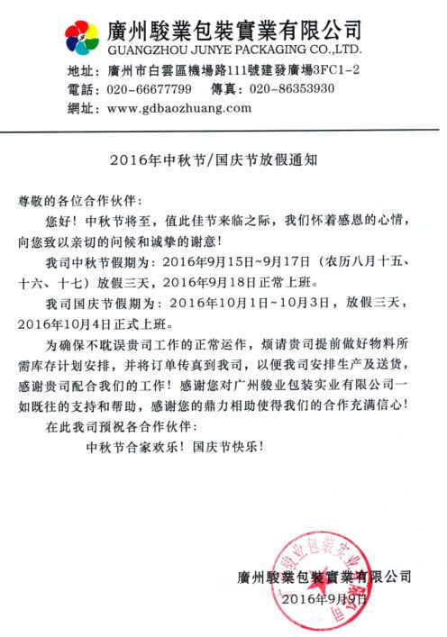 中秋佳節將至,月圓人更圓,廣州駿業包裝2016年中秋節,國慶節放假通知,9月15日(周四)-9月17日(周六)放假三天,9月18日(周 日)正常上班。我司國慶節假期為:2016年10月1日-10月3日,放假三天,10月4日正式上班。在此我司全體全功預祝各位合作伙伴:中秋節闔家歡樂,國慶節快樂