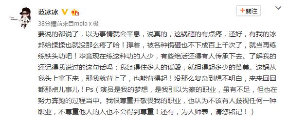 范冰冰在微博發(fā)文回應(yīng)此事,霸氣重申“我經(jīng)得住多大的詆毀,就擔(dān)得起多少的贊美”“這鍋我背得起”,并表示不該歧視任何一種職業(yè),隔空怒嗆該教授:“為人師表,請您銘記!”