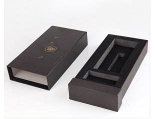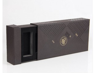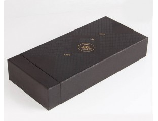 這個禮品盒定制選用的材質是1000可白板紙為內紙,裱紙則是雙銅紙,盒型是抽屜盒,盒身覆啞膠,看起來高貴神秘;可以看到這個禮品盒的表面布滿了用uv印刷出來的文字,在不同的角度可以看到不一樣的效果,這也是防偽的一種方法;盒子的logo采用的是燙金工藝,金燦燦的字體往往能讓人印象深刻,同時也凸顯了品牌質感。